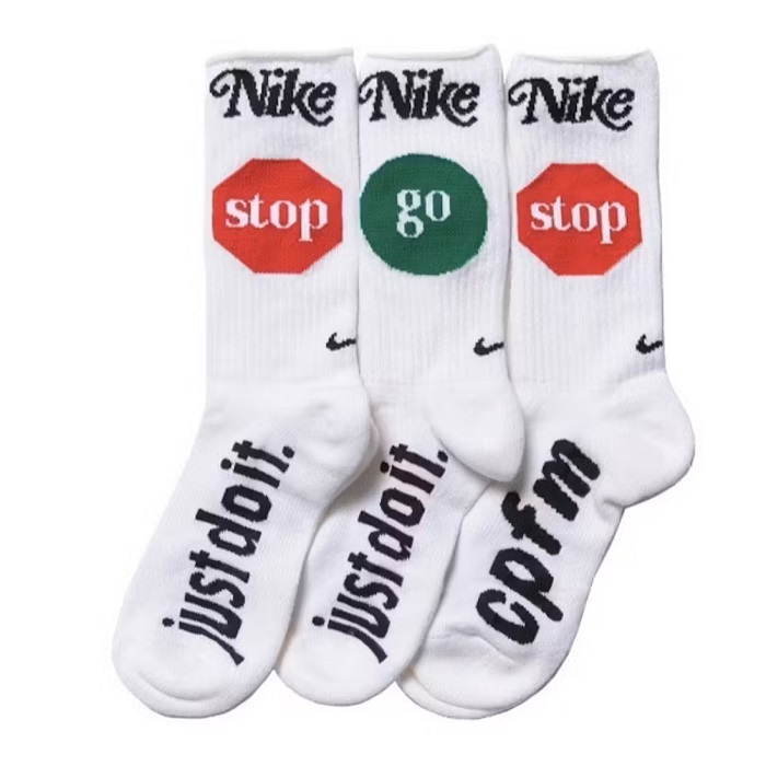 In 2021, Nike collaborated directly with CPFM. The Nike x CPFM Crew Socks are a perfect blend of sporty functionality and street-style flair. Crafted with high-quality materials, they feature unique CPFM branding alongside the iconic Nike Swoosh, showcasing a striking and eye-catching design. With a crew length, they provide ample coverage and support, making them ideal for athletic activities or casual wear. These socks seamlessly combine the best of both worlds, offering the comfort and performance associated with Nike while incorporating the edgy and contemporary aesthetics of CPFM. Whether you’re hitting the gym or elevating your everyday style, these crew socks are a fashionable accessory.