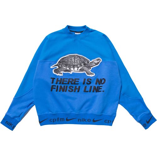 The Nike x CPFM Fleece Crew with “THERE IS NO FINISH LINE”. and a turtle emblazoned boldly on the front came from when Nike collaborated directly with Cactus Plant Flea Market. This dynamic collaboration that seamlessly merges sportswear and street style. This crewneck sweatshirt offers the ultimate blend of comfort and fashion, making it perfect for both athletic endeavors and urban adventures.